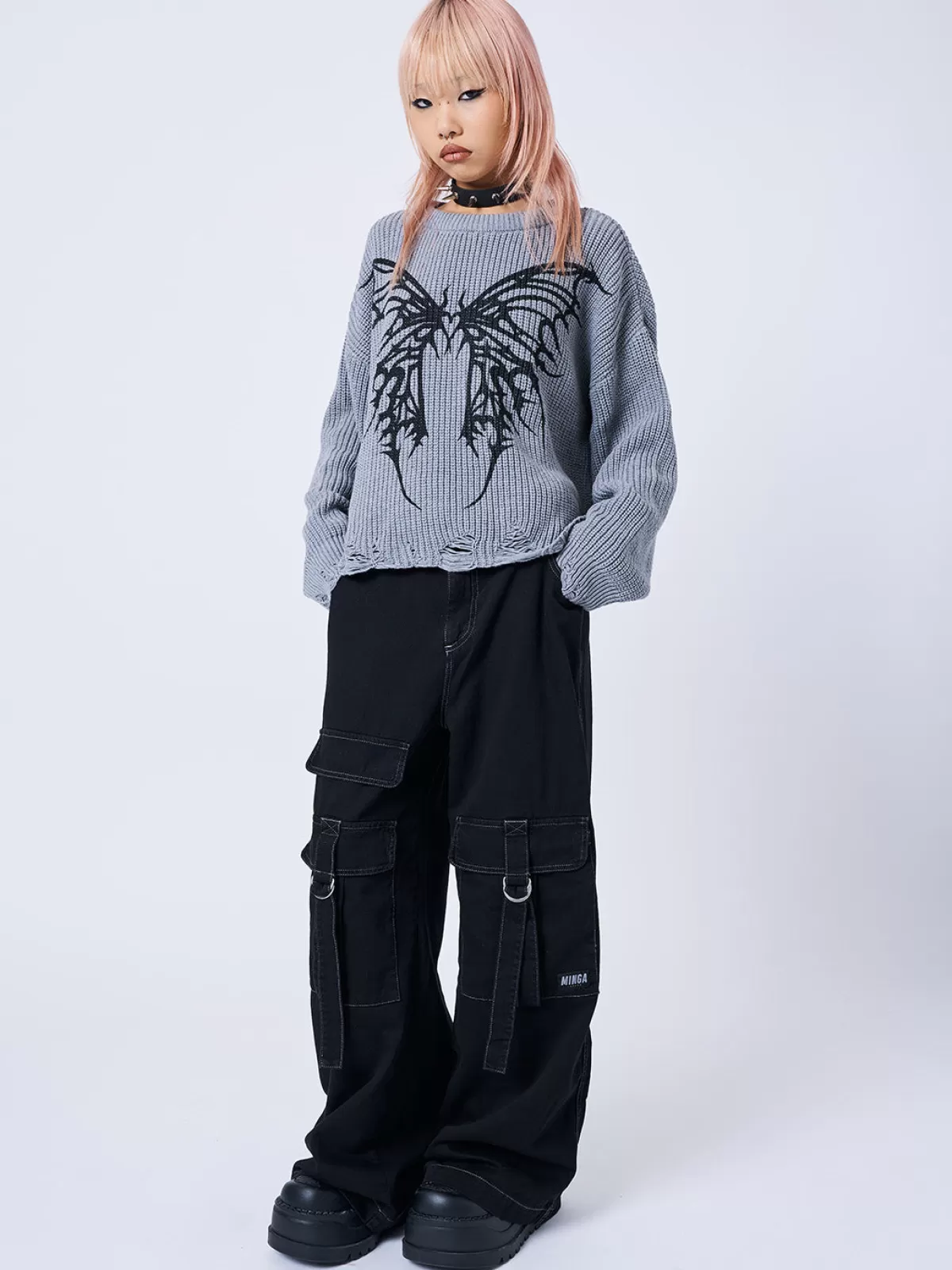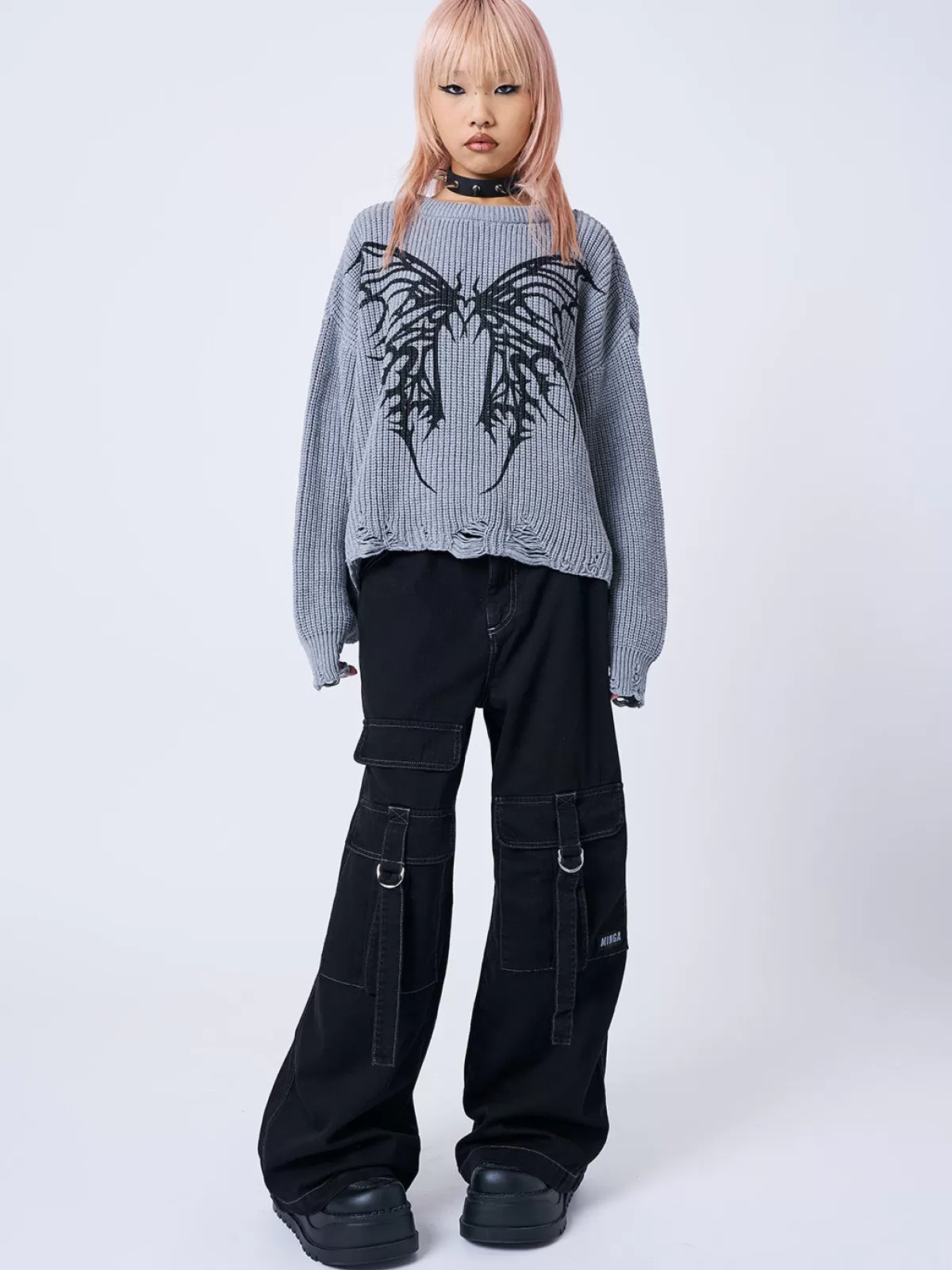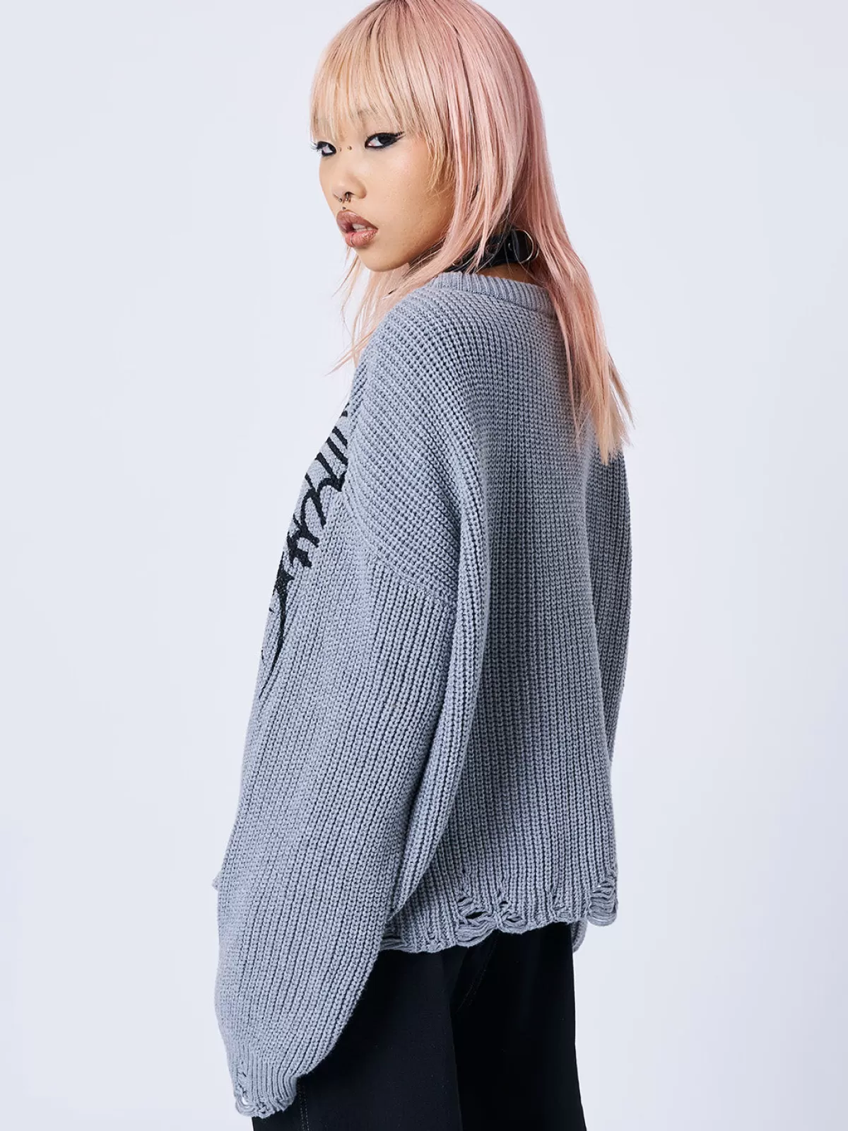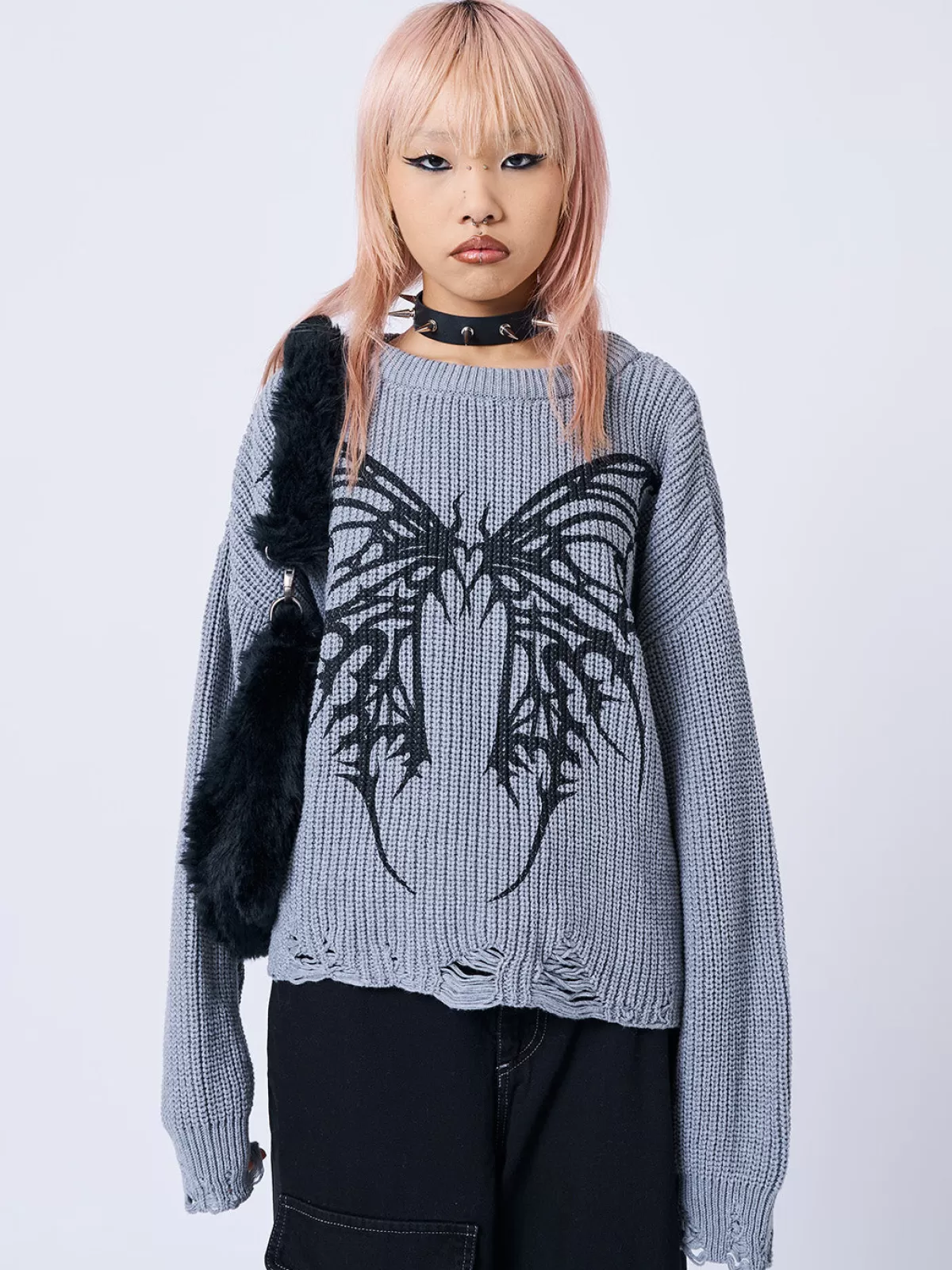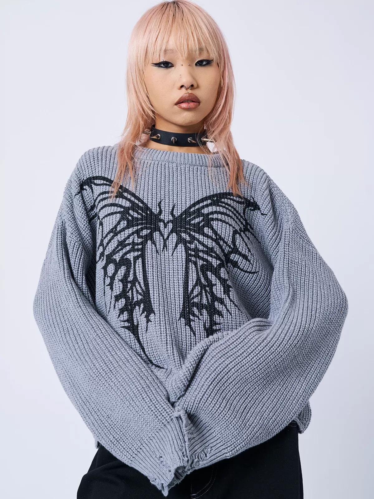 Riding those midnight waves ?Knitted jumper in greyDark butterfly graphic by Ethan StamatakisDistressed detailsLon…