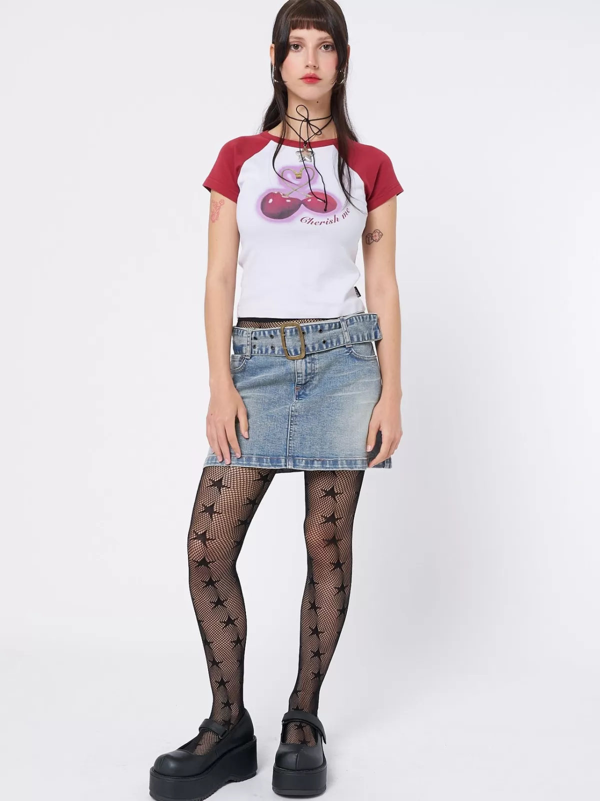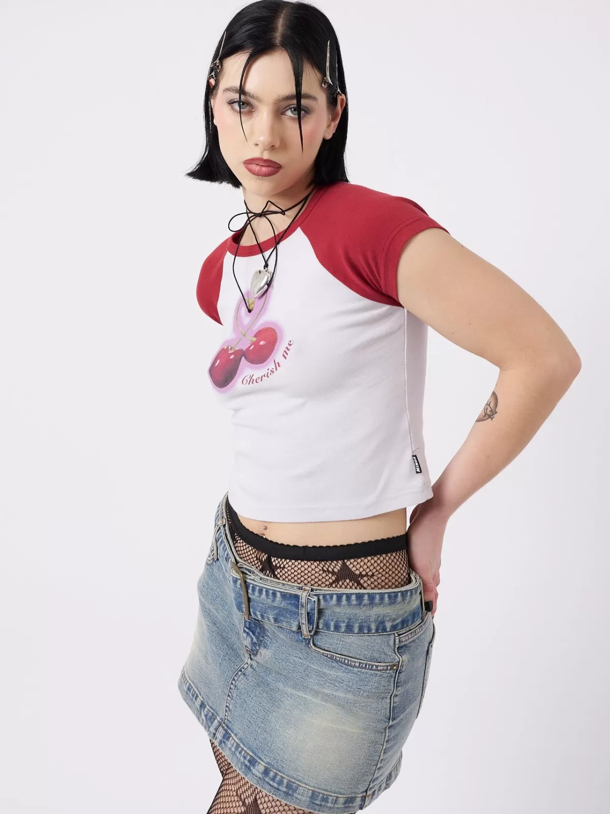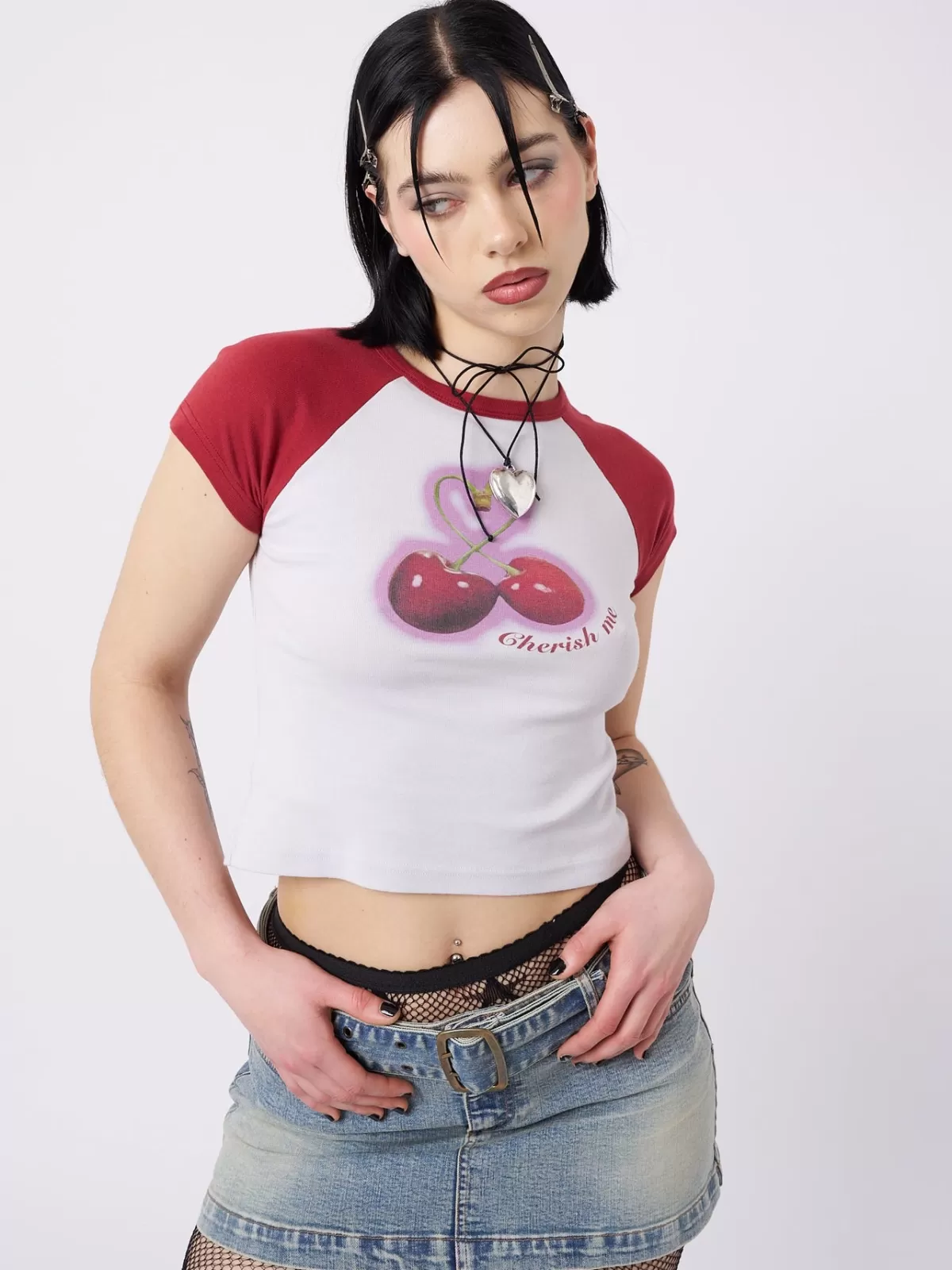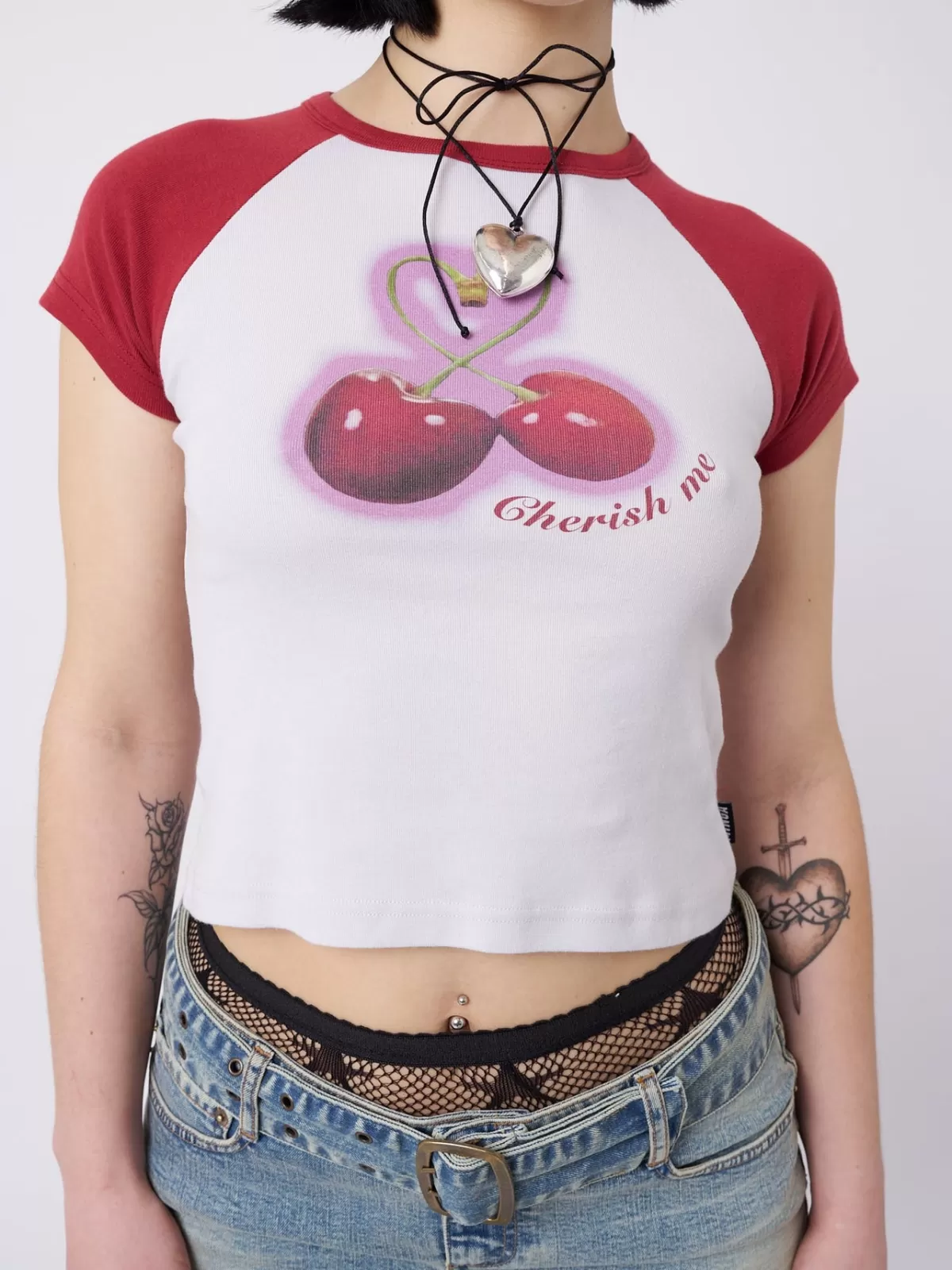 Craving a fun and vibrant addition to your wardrobe? Our Cherry Pop! Raglan Baby Tee has you covered. Combining our favorite fruit with a baby tee style, this baseball tee in red and white offers a playful and eye-catching look.
