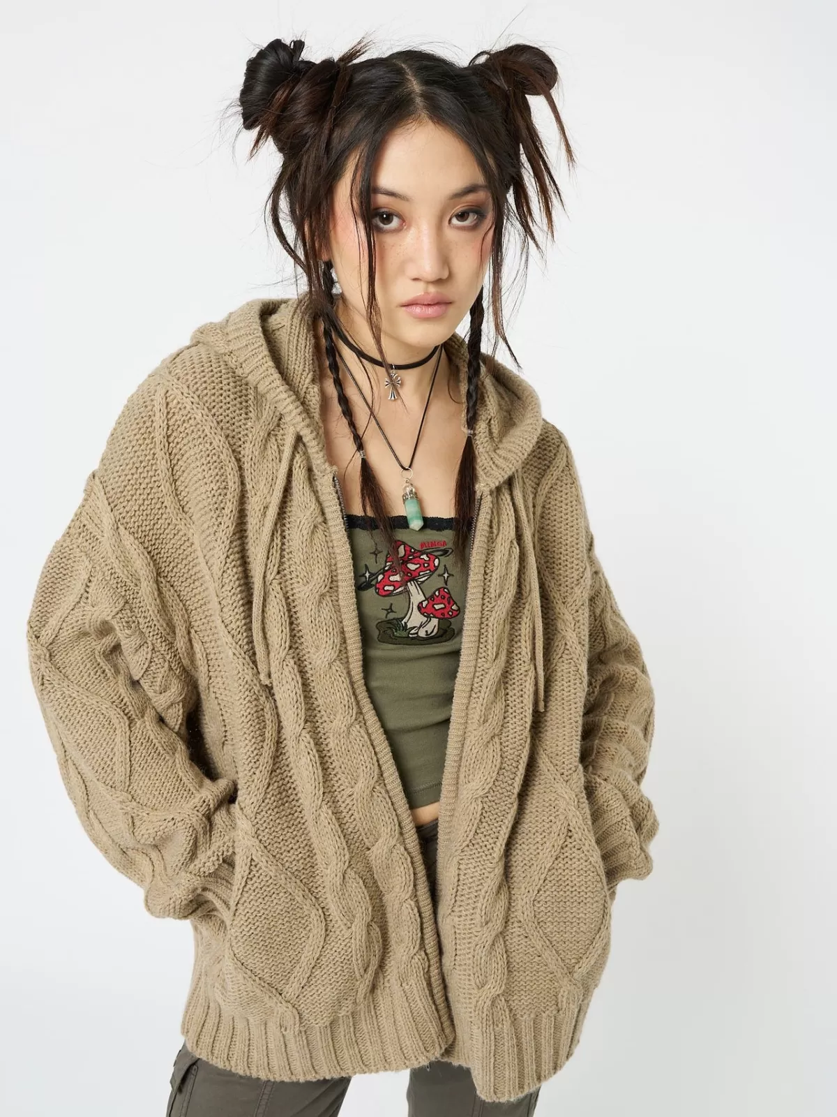 Best worn when in the mood for… cute but comfy. Cable knit hood cardigan in beigeOversized fitZip fasteningSide pocke…
