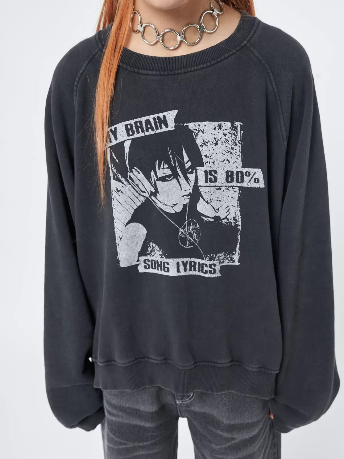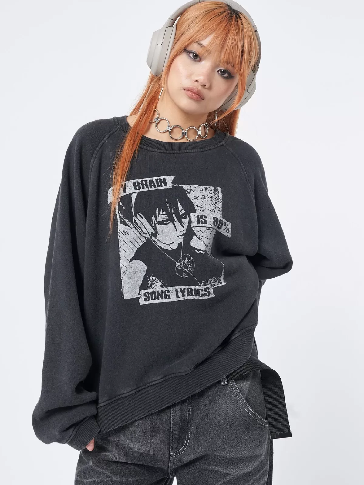 Oversized sweatshirt in washed black”My Brain is 80% Song Lyrics” front graphic printRaglan long sleevesSide slits Crew…