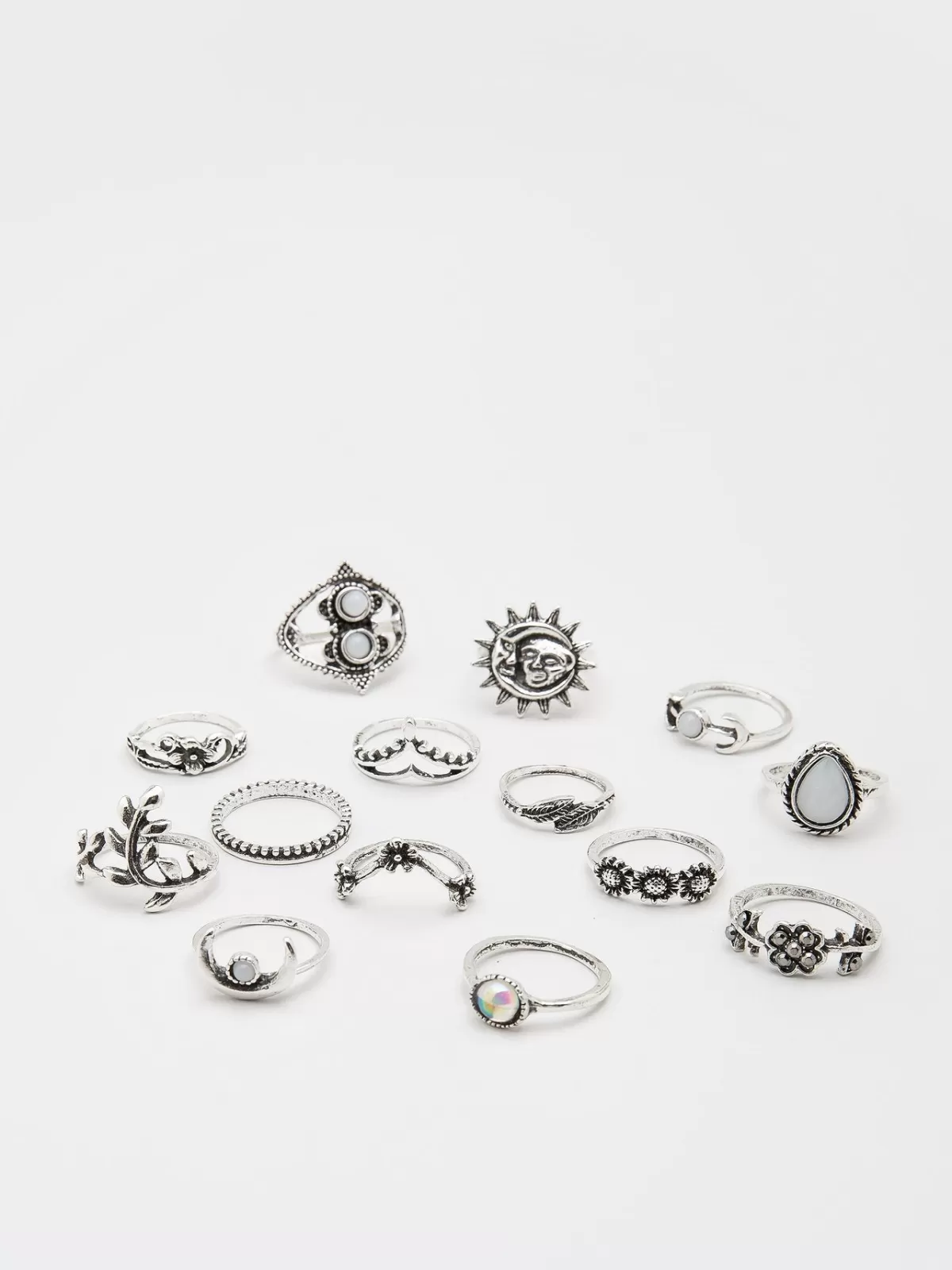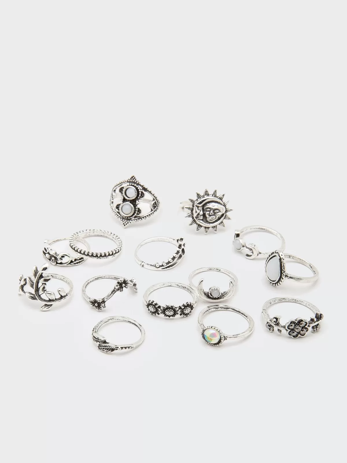Set of 14 mystical ringsGrunge vibesSun, moon, flowers and stonesEngraved designSilver plated1.4-2cm | 0.55-0.78”